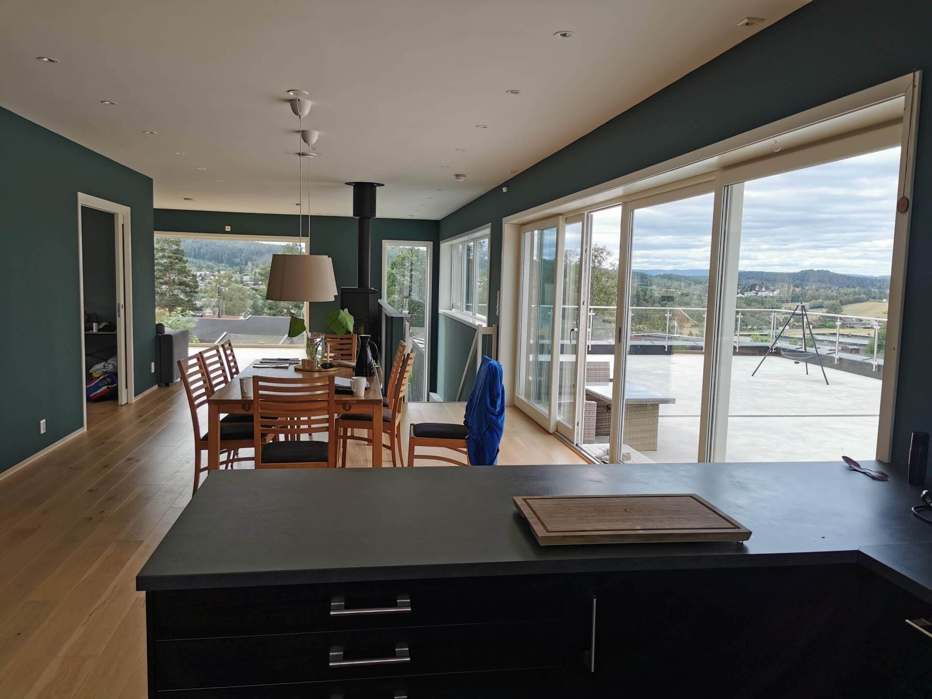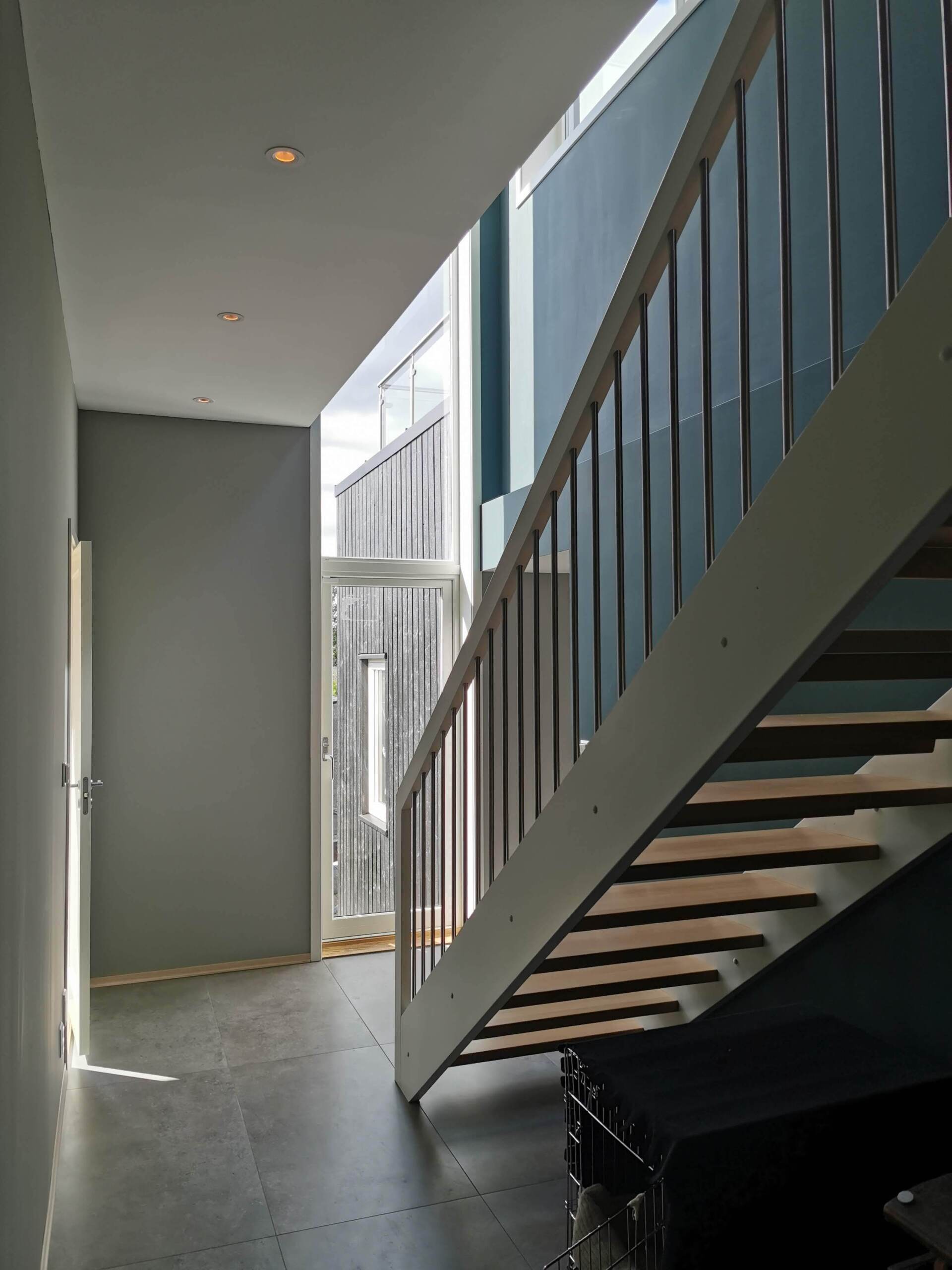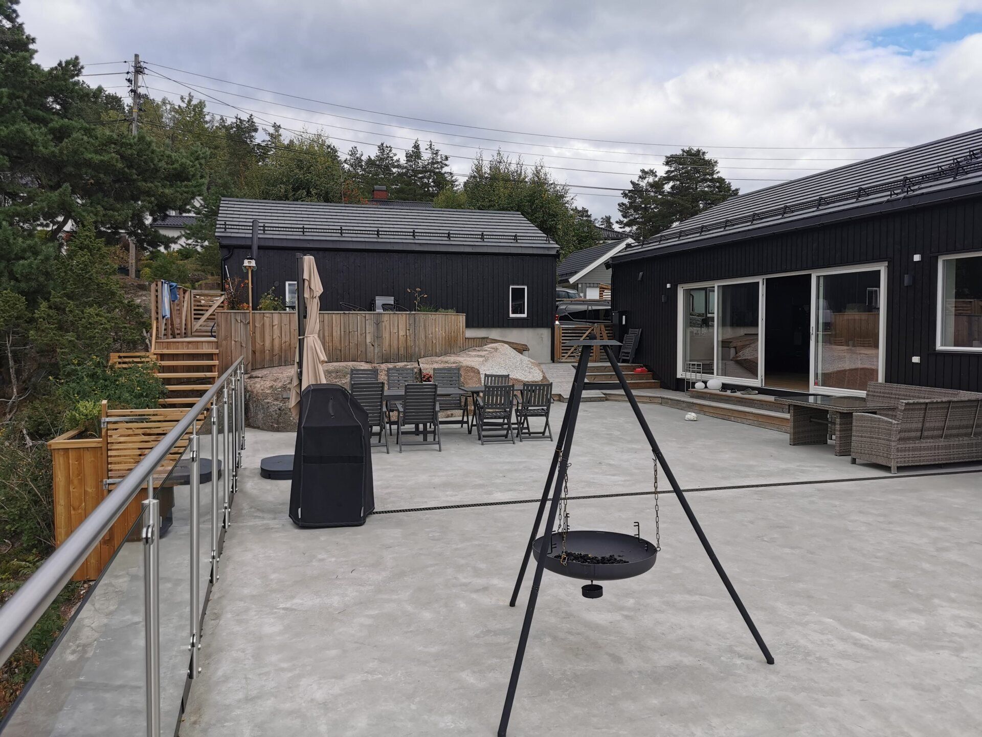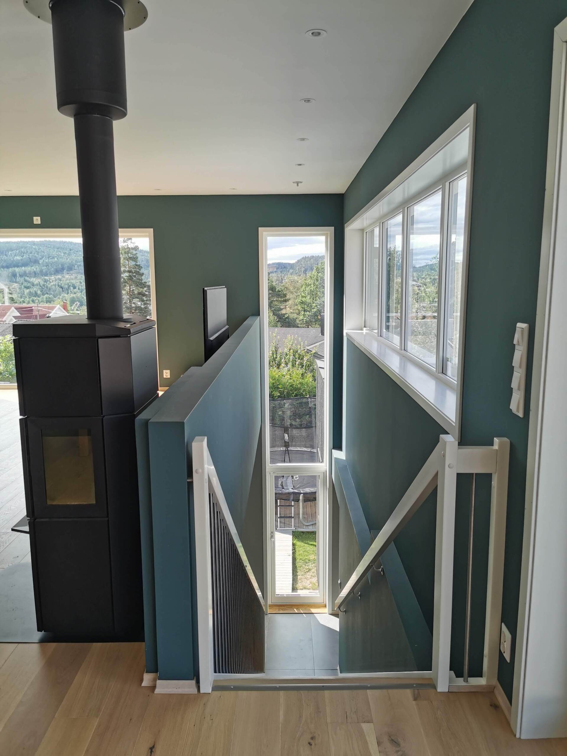 Oppholdsrom er plassert i øverste etasje med adkomst til stor terrasse med forbindelse til terreng. Soverom, bad, vaskerom og boder ligger i underetasje under oppholdsrom og terrasse.